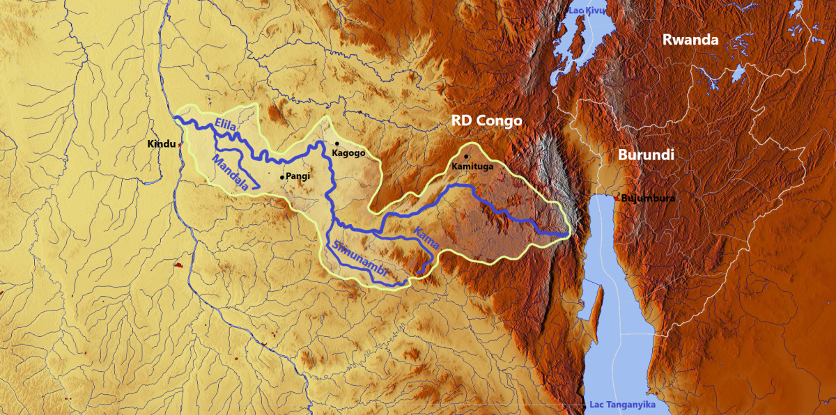 La rivière Elila prend sa source dans la province du Sud-Kivu sur le territoire d'Uvira, sur les monts Mitumba à plus de 2500 m d'altitude. A cet endroit, la crête de la montagne constitue la ligne de partage des eaux entre le sous bassin du Lualaba et celui du Tanganyika.