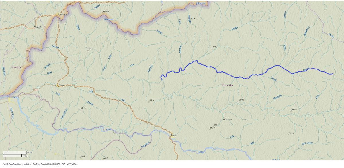 Elle prend sa source dans le territoire de Bondo, à l'ouest du village Bangoye, à 636 m d'altitude. De là, elle s'écoule d'est en ouest jusqu'à sa confluence avec la rivière Bili, près du village Masabe (49), à 493,8 m d'altitude.