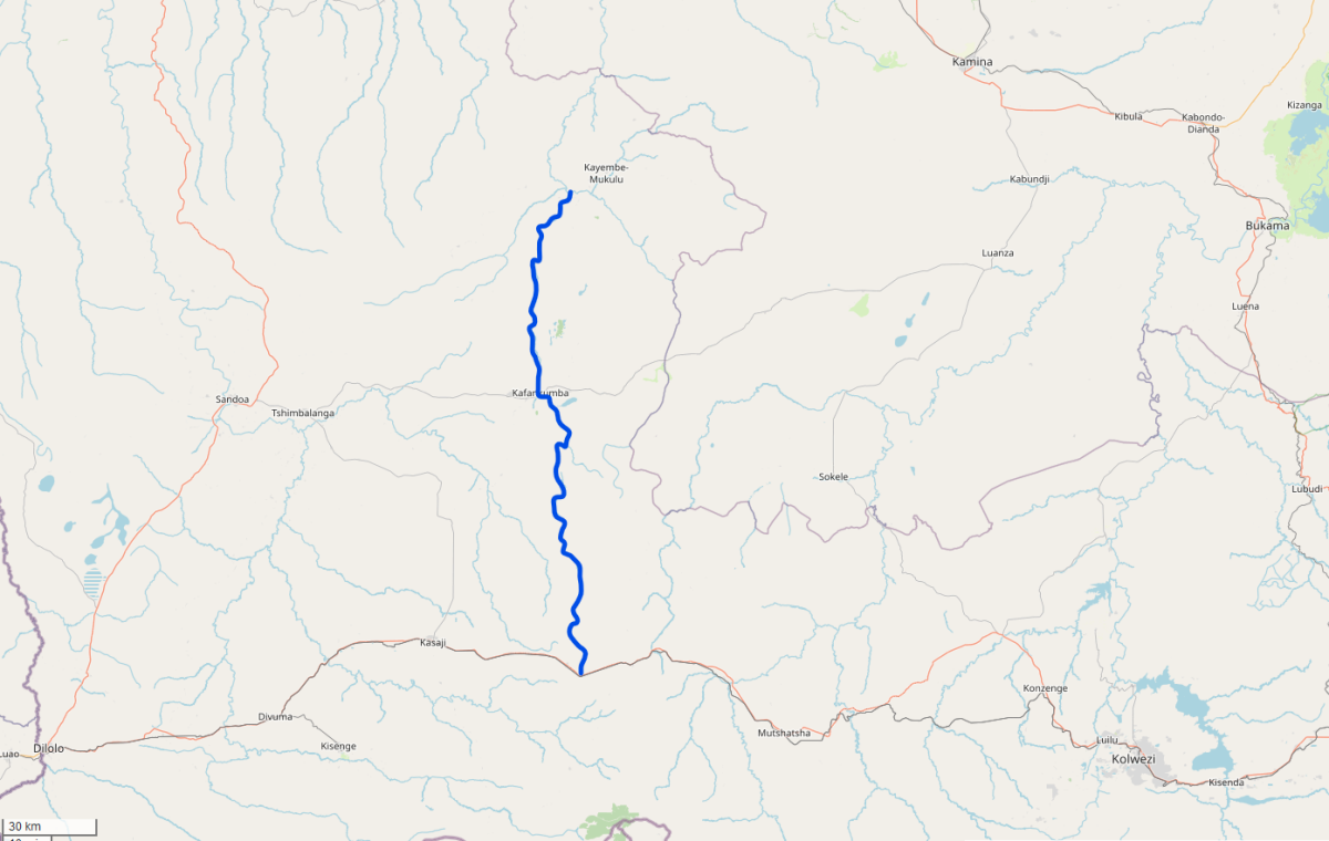 Elle coule entièrement dans la province de Lualaba où elle prend sa source près de la localité de Sanikosa sur le territoire de Dilolo. Elle coule ensuite en direction nord jusque dans le territoire voisin de Sandoa où elle est enjambée par un pont de la route provinciale 606 près de la localité de Kafunkumba non loin du lac Kafunkumba dont les eaux rejoignent la Lueo par un affluent de rive droite.