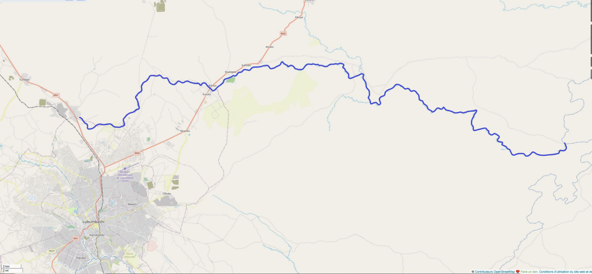 Après avoir parcourcouru une distance de 130 km, la rivière Lwiswishi se jette dans la rivière Kafubu à l'altitude 1097 mètres, entre Lubumbashi et Kiniama.