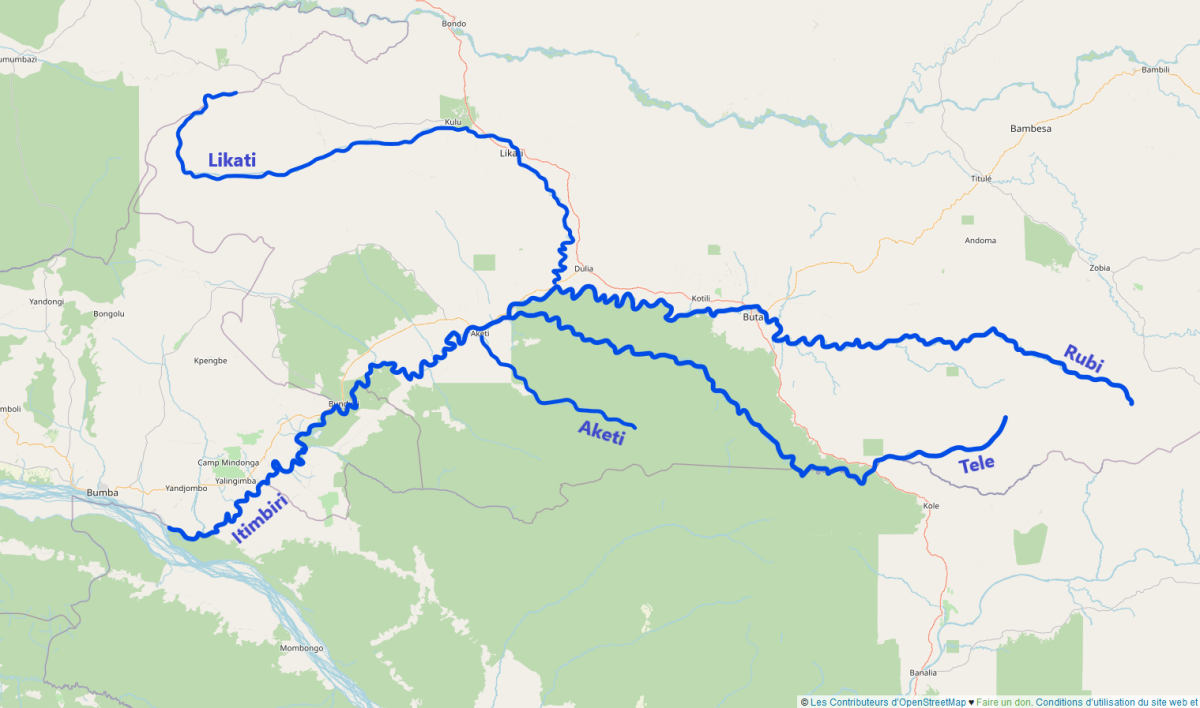 La Rubi est longue de 439 km et est un sous affluent du fleuve Congo dans le bassin du Moyen Congo.