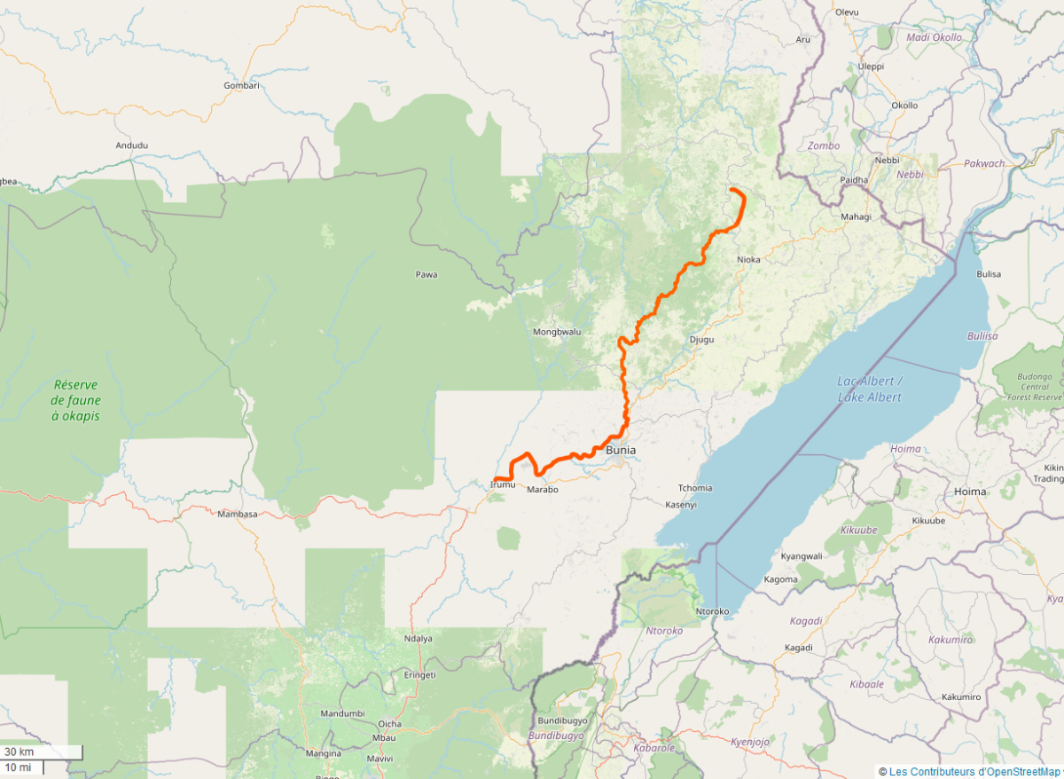Après un parcours de 211 km, elle finit par se jeter dans la rivière Ituri à proximité de la localité d'Irumu à 880 m d'altitude.