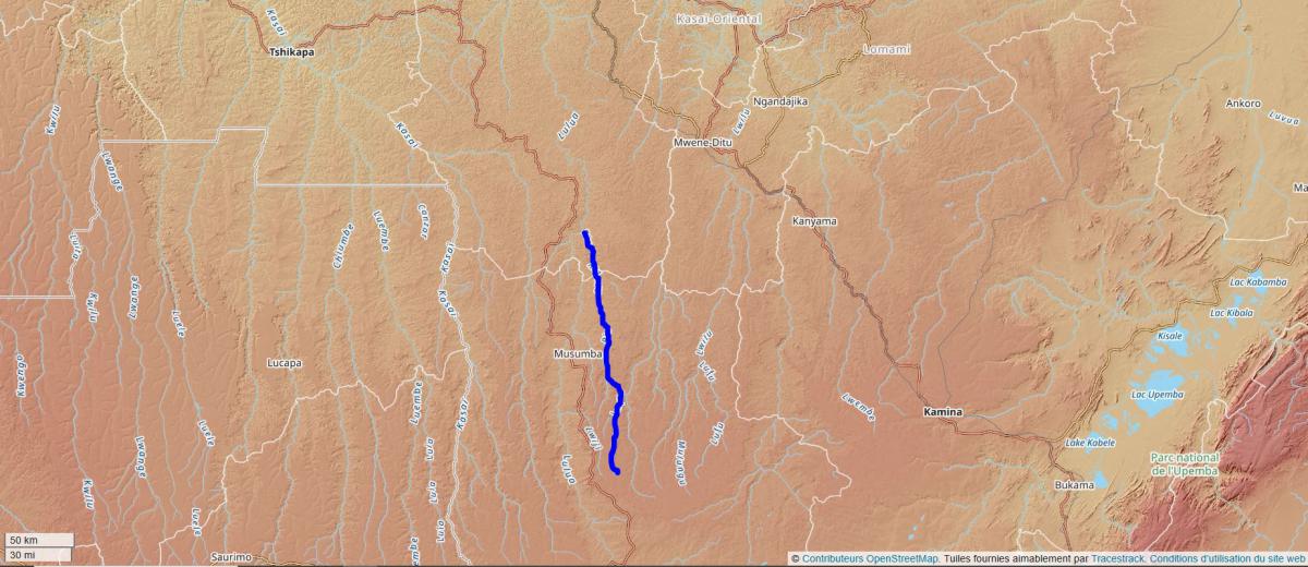 Elle prend naissance sur le plateau Katangais, dans le territoire de Sandoa, province de Lualaba, à plus de 1000 mètres d’altitude. Ensuite, elle s'écoule en parallèle de la route nationale 39 vers le nord, jusqu’au territoire de Kapanga. Là, elle passe la route RP601 près du village de Katapakishi. En quittant Kapanga, elle entre dans la province du Kasaï-Central, dans le territoire de Luiza, et rejoint la rivière Lulua après un trajet d’environ 216 km.